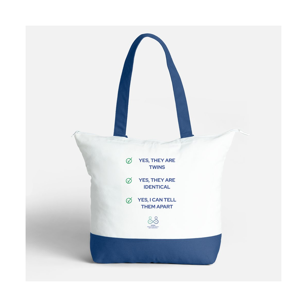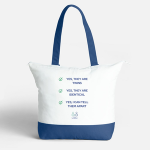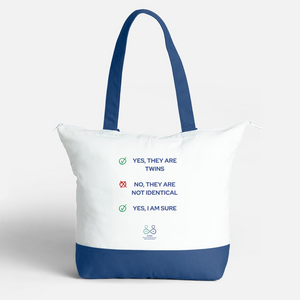 This white & blue SEMBA tote bag does it all - it's a nappy bag, it reduces the frequency of "are they twins?" from pesky strangers, and it has a zip!